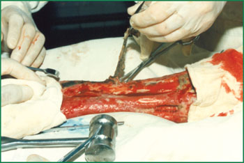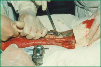 4、 用骨鉆在骨面按間隔1厘米鉆孔,鉆孔深度達髓質,有微出血。