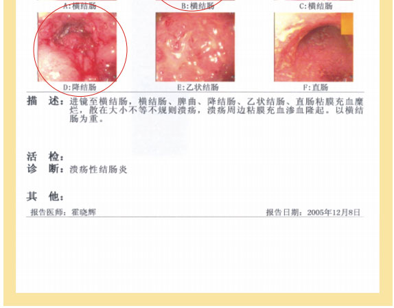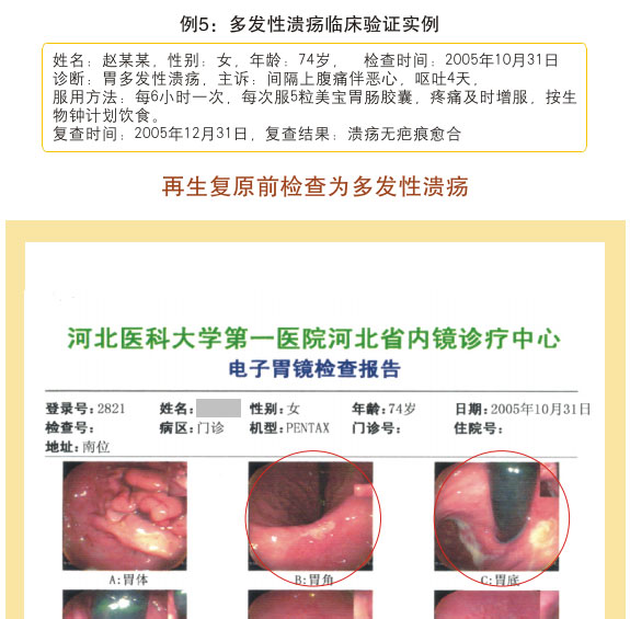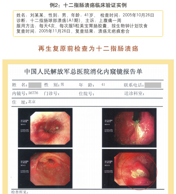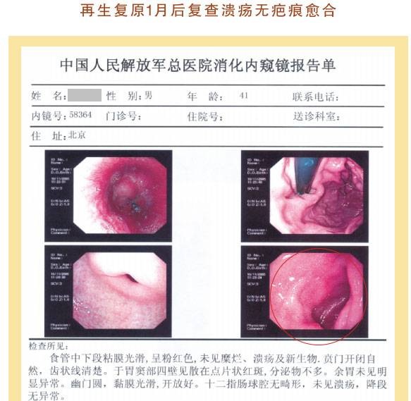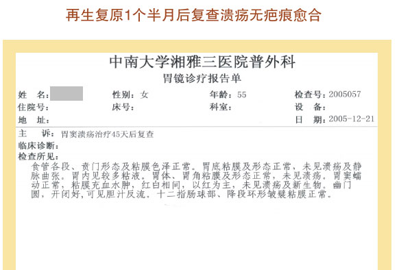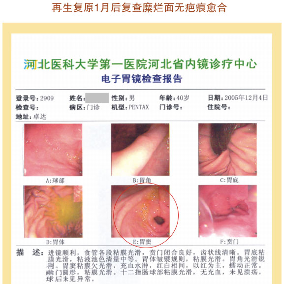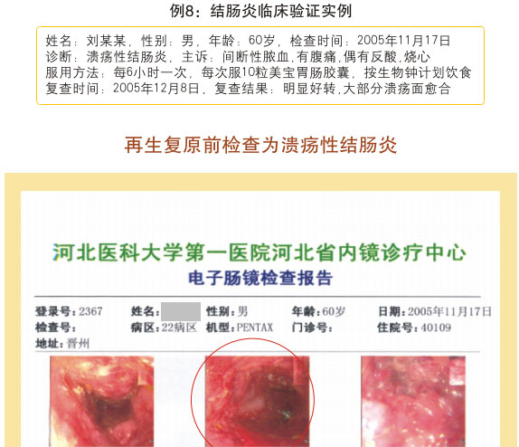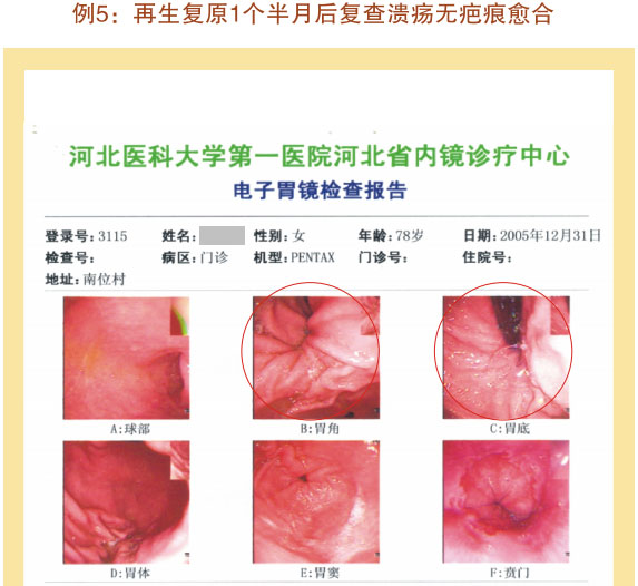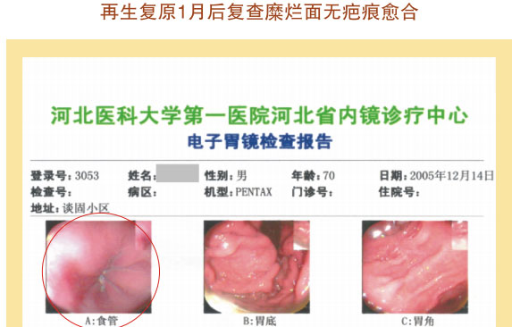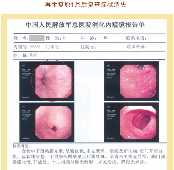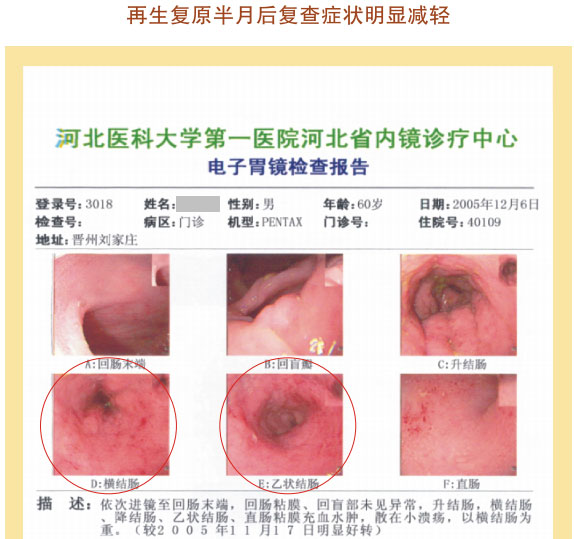 例2:蓋某某,女,54歲,2007年6月開始胃腸器官原位再生復原,一年后整個胃腸系統(tǒng)大部分再生復原,粘膜體征均表現(xiàn)為年輕狀態(tài)。