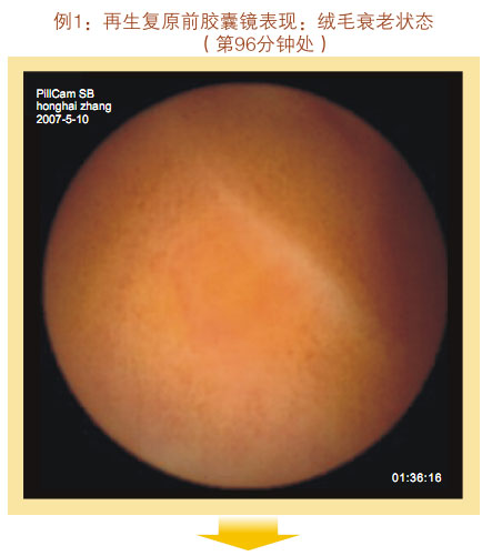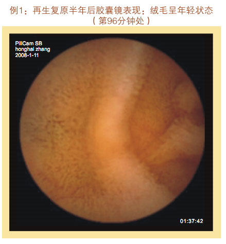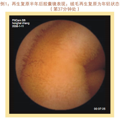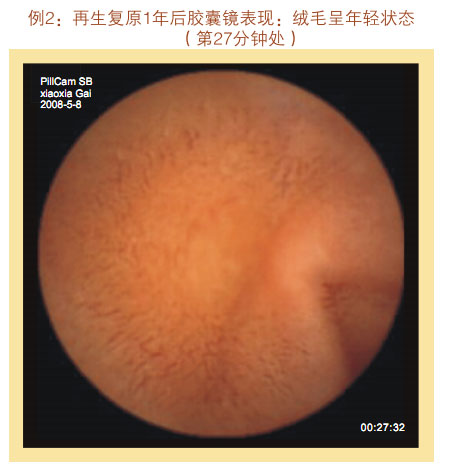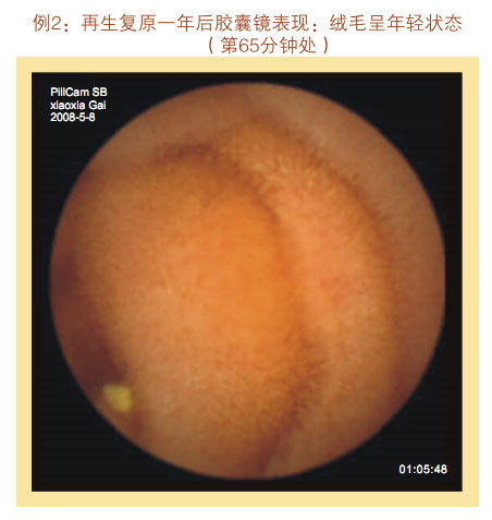 再生復原一年后膠囊鏡表現(xiàn):小腸粘膜和粘膜下層明顯增厚,看不到粘膜下血管網(wǎng)及血管畔,絨毛濃密、長度增加,直徑增粗,沒有明顯斷裂、脫落、脫失的絨毛粘膜,隱窩變深。整個胃腸黏膜系統(tǒng)呈現(xiàn)為年輕健康的狀態(tài)。