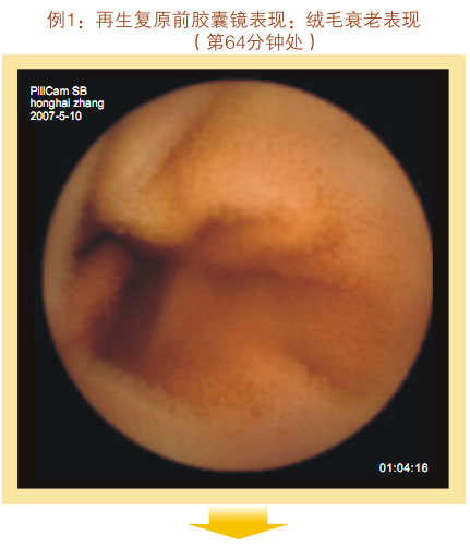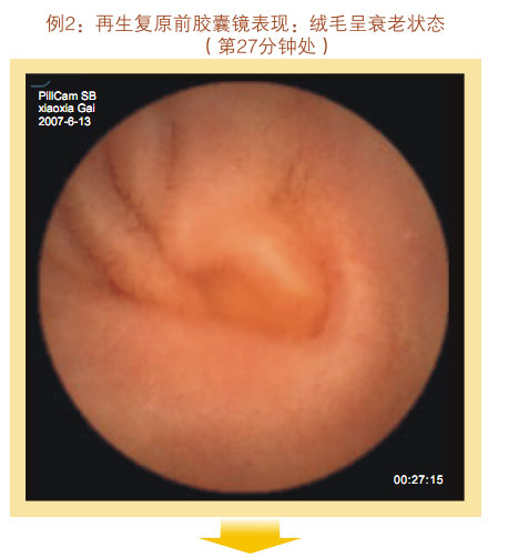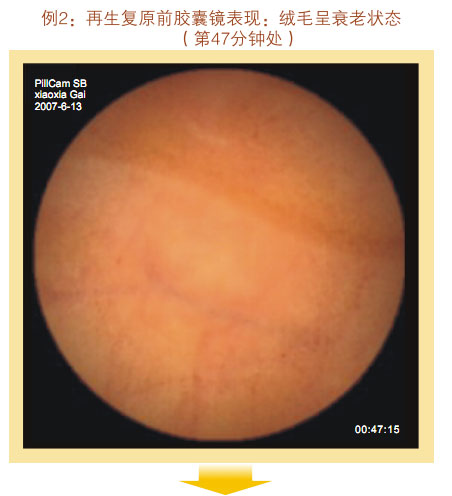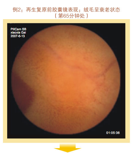 再生復原前膠囊鏡表現(xiàn):小腸粘膜和粘膜下層明顯萎縮退化,變薄,粘膜下血管網(wǎng)及血管畔清晰可見,小腸絨毛稀疏、長度變短、退化明顯,部分區(qū)域絨毛完全脫失,隱窩變淺,整個絨毛面積變小。整個胃腸黏膜系統(tǒng)呈現(xiàn)衰老狀態(tài)。