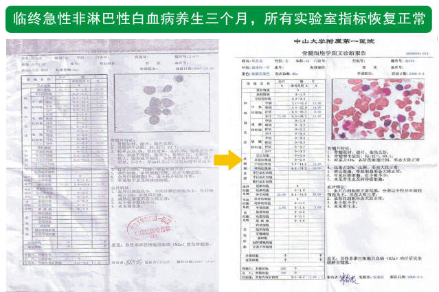 另一位患者是白血病,大家知道白血病比較可怕,但對(duì)于我們的養(yǎng)生來(lái)說(shuō),又顯得不是那么可怕。我們做的動(dòng)物實(shí)驗(yàn)中可以讓骨髓再生。我們用鈷60的照射破壞骨髓,無(wú)論怎么破壞,通過(guò)讓骨髓再生,動(dòng)物的骨髓都可以保持健康,凡是沒(méi)有吃再生物質(zhì)的則繼續(xù)惡化。這位患者醫(yī)院診斷為白血病,已經(jīng)多次復(fù)發(fā),醫(yī)院對(duì)這位患者已經(jīng)放棄了醫(yī)學(xué)治療。1月底加入我們的癌癥養(yǎng)生計(jì)劃。到3月3號(hào)檢查,她的骨髓已經(jīng)變成正常的了,其身體現(xiàn)在和正常人一樣。
