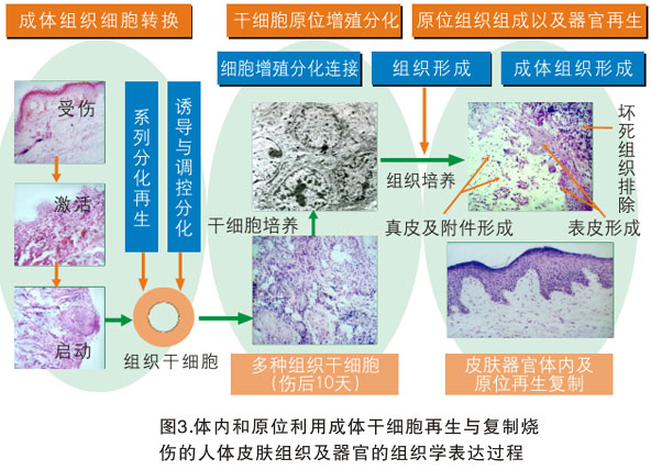 人類組織與器官體內(nèi)和原位再生、復(fù)制的圖譜具有代表性,而不同的組織器官有各自的圖譜,我們將于近期公布。圖3顯示的是燒傷的人類皮膚組織器官體內(nèi)和原位利用干細(xì)胞再生和復(fù)制的組織學(xué)表達(dá)過程。