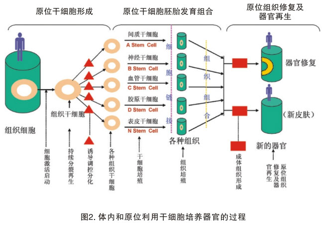 燒傷再生療法是目前唯一能在體內(nèi)和原位培養(yǎng)干細(xì)胞來成功修復(fù)與克隆器官的技術(shù)。相信該技術(shù)能盡早揭開人類生命體延續(xù)之謎。繼成功克隆人體最大器官皮膚后,其他器官的克隆過程將很快被證實(shí)。2002年5月28日,我公布了一項(xiàng)研究成果,人類組織器官再生復(fù)制圖譜,并申請了專利。美國網(wǎng)站www.stemcellresearchnews.com對這一重大事件做了大篇幅報(bào)道。圖譜客觀地再現(xiàn)了細(xì)胞修復(fù)損傷組織,的確是分化和整合的過程。第一,機(jī)體受傷,存活細(xì)胞原位啟動,形成成體干細(xì)胞。第二,成體干細(xì)胞被誘導(dǎo)并定向分化為各種組織的干細(xì)胞,將最終完成組織修復(fù)。第三,新生組織產(chǎn)生,再生的組織干細(xì)胞與新生組織連接。最后,各種新生組織組合成器官受損部分,形成新的功能組織器官,進(jìn)而實(shí)現(xiàn)體內(nèi)和原位靶組織器官的修復(fù)與再生(圖2)。