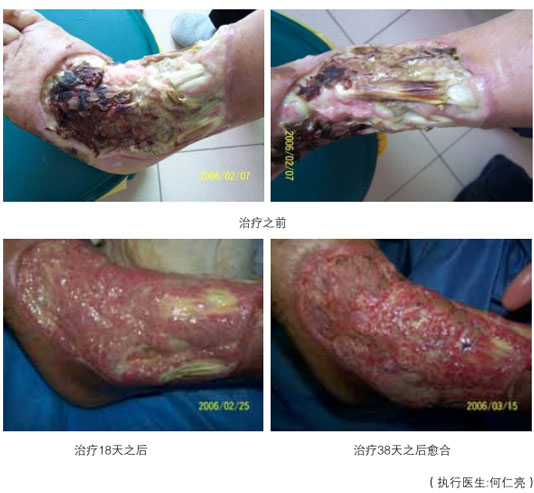 糖尿病潰瘍是當(dāng)今世界還沒有有效治療方法的潰瘍,本研究再生療法已成功地對這一潰瘍像治療一般創(chuàng)面那樣,原位再生新的組織,使?jié)冊偕?,避免了截肢殘廢。動脈閉塞性肢體遠(yuǎn)端壞死潰瘍更是世界醫(yī)學(xué)治療的難題,本研究仍可實現(xiàn)創(chuàng)面的再生復(fù)原愈合。