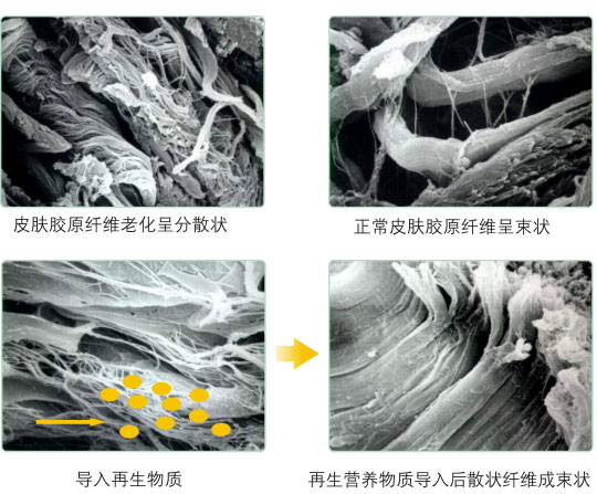 ● 吸收的再生營養(yǎng)物質(zhì)促使已經(jīng)存在的衰老散狀纖維絲成束,恢復(fù)真皮的彈力和豐滿度。