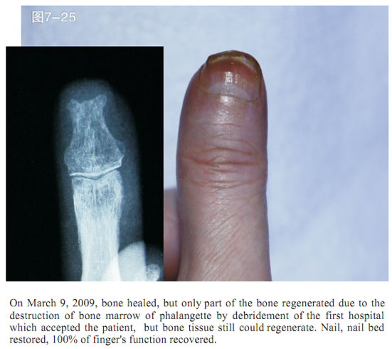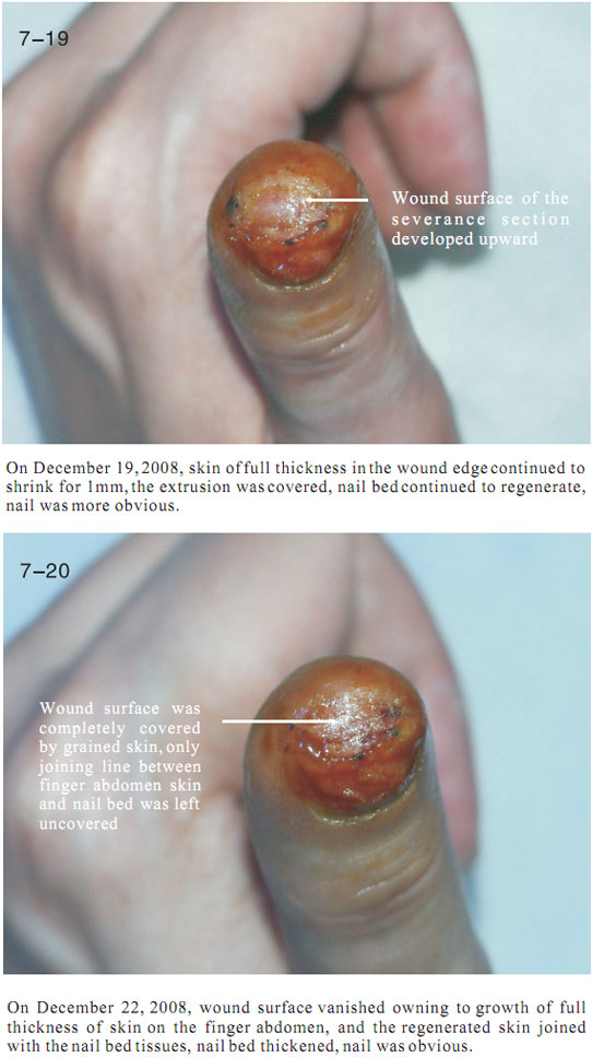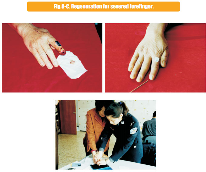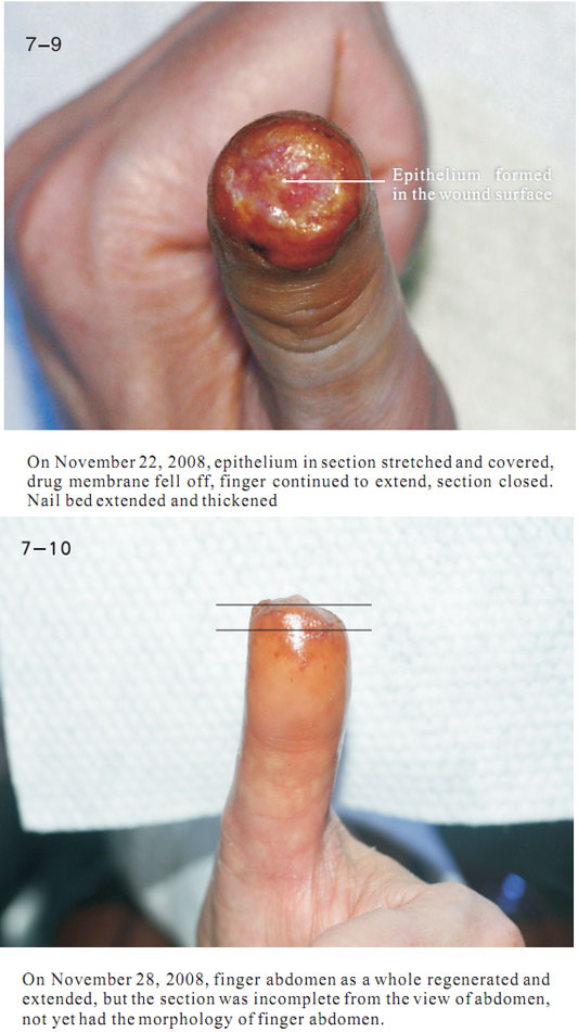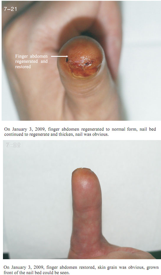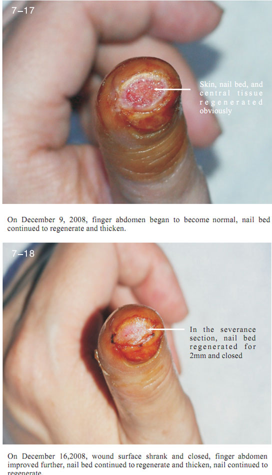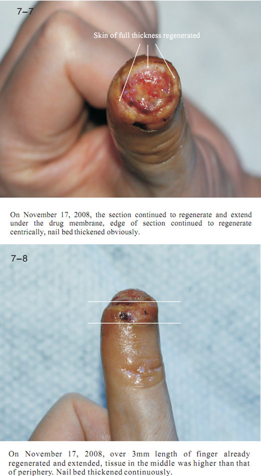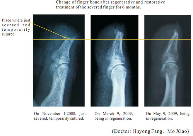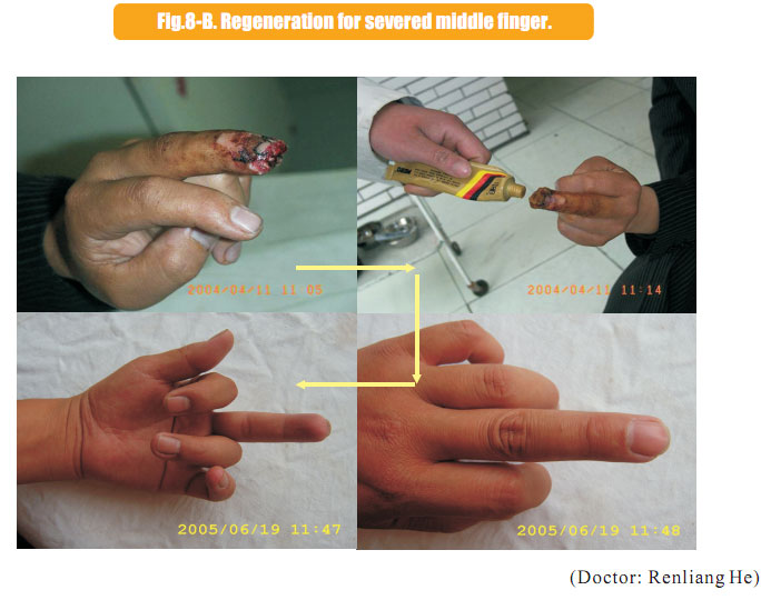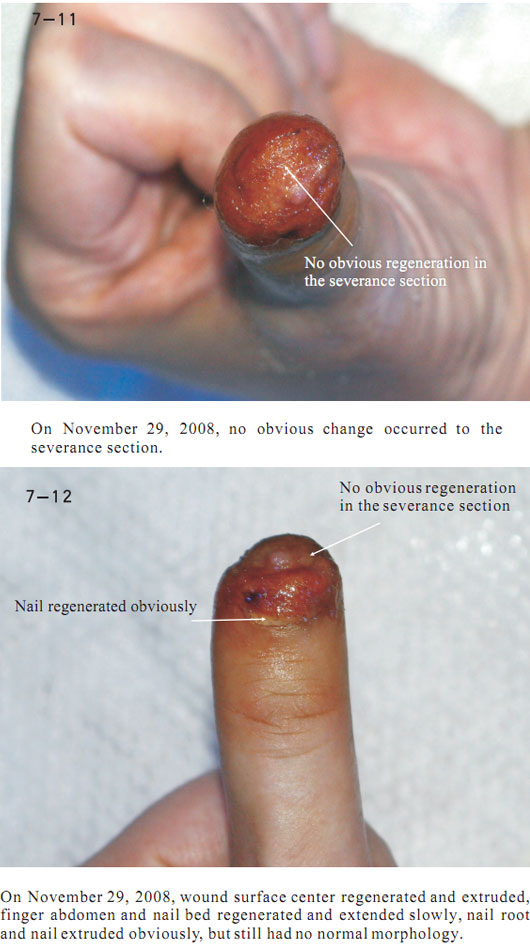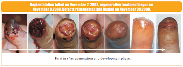 The data here showed the regeneration of severed last segment of finger, “severed” here means totally separated and completely defective, including bones, muscles, nerves, blood vessels, soft tissues, and all tissues composing skin.  Generally, replantation is currently used in surgical therapy for treating the severed fingers.  While, for the last segment, because of its very small blood vessels and the tiny location of a finger end, it is really difficult for the tissues to survive after the surgery; the alternative method is only to be a destructive method of wound section closure, this resulting in a life long deformity of the finger.
