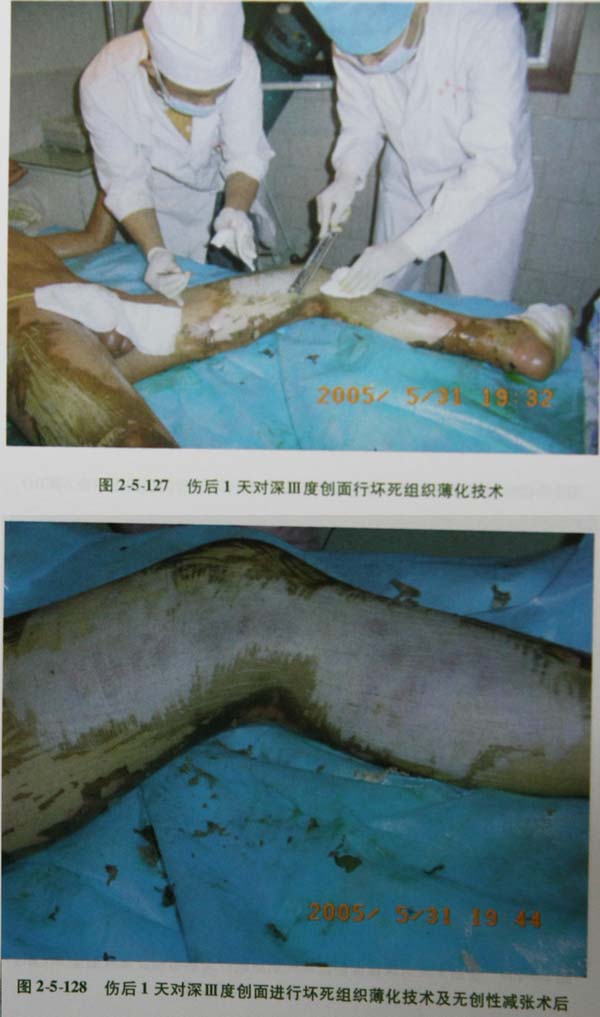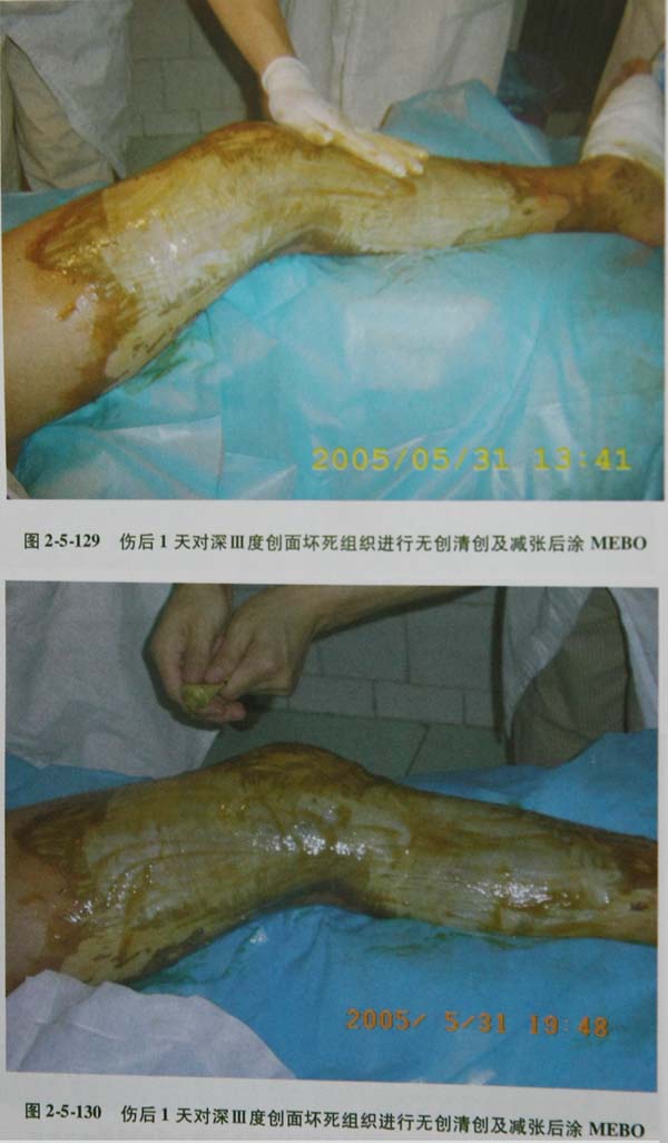 2在Ⅲ度深型創(chuàng)面的處置過程中,MEBT/MEBO仍不失為一種療法,早期創(chuàng)面可在MEBO保護(hù)下采用外科手術(shù)薄層切削壞死焦痂(壞死組織薄化技術(shù)),以減少燒傷毒素的吸收。但以創(chuàng)面保留部分壞死組織為度(即切除壞死組織的2/33/4),以盡量保留有活性的組織為原則,并始終以MEBO保護(hù)創(chuàng)面,促使創(chuàng)面殘存的壞死組織液化排除。