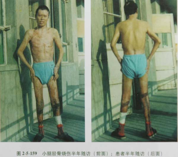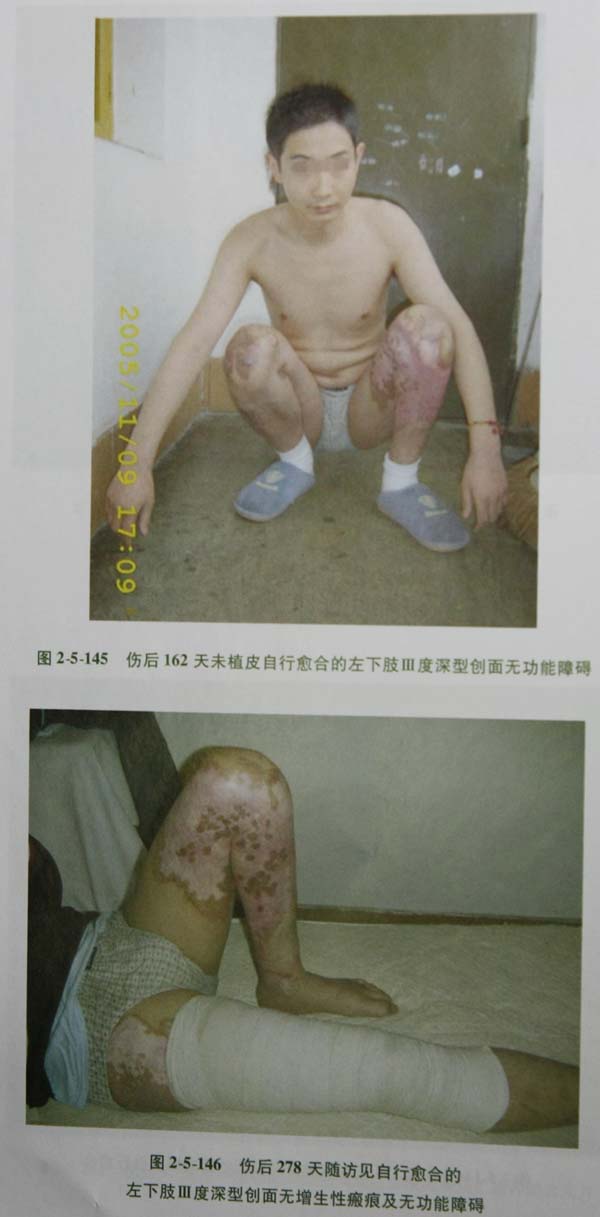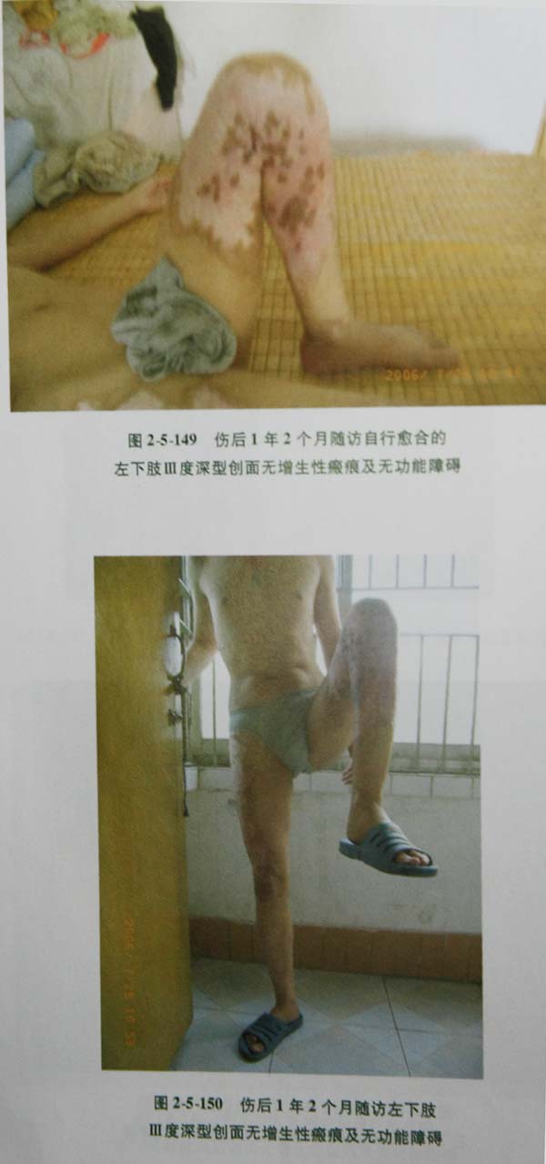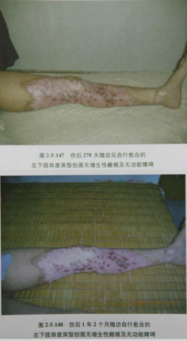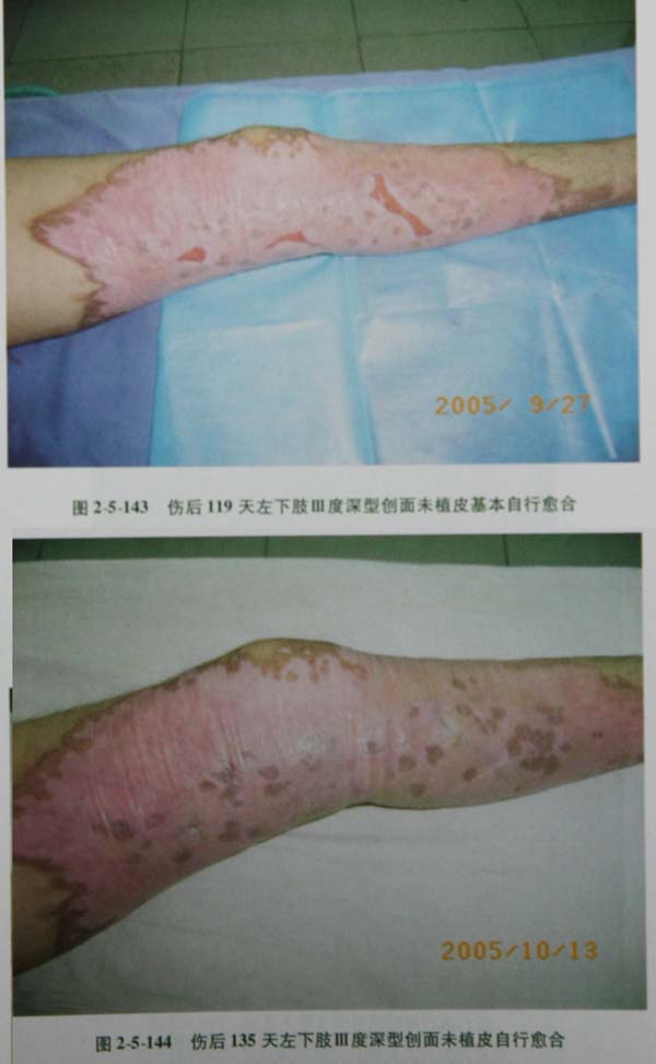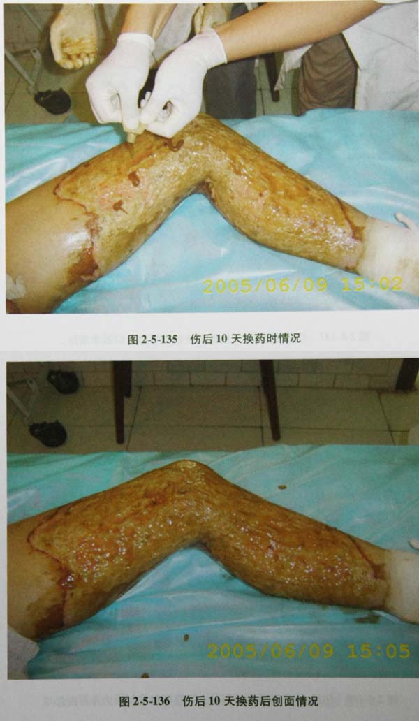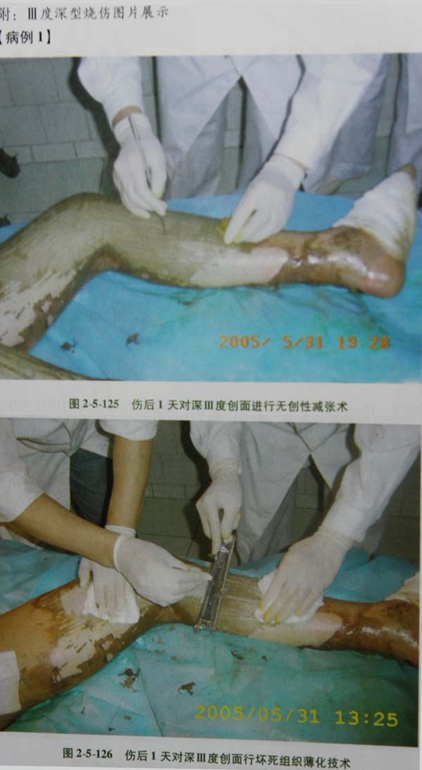 1)焦黃或炭化,焦痂質(zhì)硬干燥、涼,不治療或采用干法治療者,傷后12天透過焦痂可見栓塞的粗大血管網(wǎng)或切開焦痂見肌肉紫暗無收縮性或關(guān)節(jié)、骨骼外露。