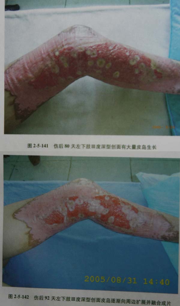 1創(chuàng)面直徑在610cm以內(nèi),應(yīng)用MEBO保護(hù)下的創(chuàng)面邊緣也可以原位再生復(fù)原擴(kuò)展封閉創(chuàng)面,如創(chuàng)面過大,傷員全身情況較差,也可以MEBO培養(yǎng)創(chuàng)面后再以局部植皮等綜合治療方式封閉創(chuàng)面。