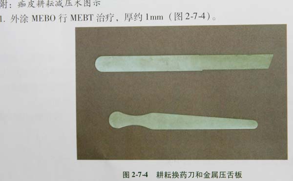 痂皮劃痕耕耘減壓術(shù)是指對深Ⅱ度深型創(chuàng)面用耕耘換藥刀耕耘燒傷創(chuàng)面壞死皮膚,減輕淤滯缺氧細(xì)胞壓力,促其恢復(fù)。深Ⅱ度深型創(chuàng)面殘存少量真皮網(wǎng)狀層細(xì)胞,淤滯帶已明顯生成,在MEBT/MEBO作用下,可以部分恢復(fù)生機。因壞死真皮組織已形成痂皮,經(jīng)過痂皮耕耘減壓術(shù)和MEBO治療,使部分壞死組織加速溶解脫落,創(chuàng)面在MEBO作用下,再生復(fù)原創(chuàng)面。