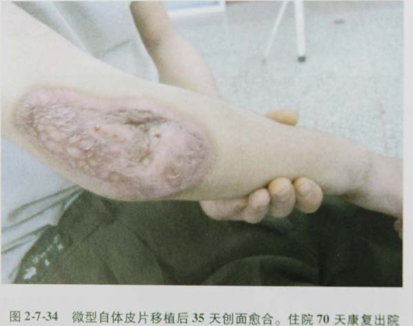 3)一般在1015天即可見暴露骨骼的鉆孔部位長出肉芽組織,此種肉芽組織在MEBO的作用下逐漸擴(kuò)展以至覆蓋暴露的骨關(guān)節(jié),術(shù)后2025天肉芽組織長滿,可行自體皮簇內(nèi)植術(shù)治療。此為關(guān)節(jié)擴(kuò)創(chuàng)肉芽培植術(shù)階段。對(duì)已經(jīng)植皮成活的創(chuàng)面繼續(xù)應(yīng)用MEBO外涂,可促進(jìn)皮片伸展愈合并可減輕疤痕的生成,保證肢體功能的恢復(fù)。