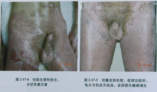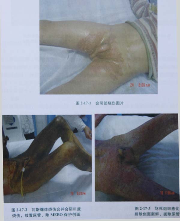2172瓦斯爆炸致全身多處燒傷,合并會陰部Ⅲ度燒傷,常規(guī)安置尿管,耕耘清創(chuàng),直接將MEBO涂抹在會陰部;圖2173壞死組織不斷液化排除,創(chuàng)面新鮮,拔除尿管,鼓勵自解小便;圖2174創(chuàng)面生理性愈合,見點狀色素沉著;圖2175陰囊皮膚松軟,收縮功能好,包皮長度與傷時無明顯區(qū)別,皮膚仍松軟,可翻開,暴露龜頭,會陰部無瘢痕增生。
