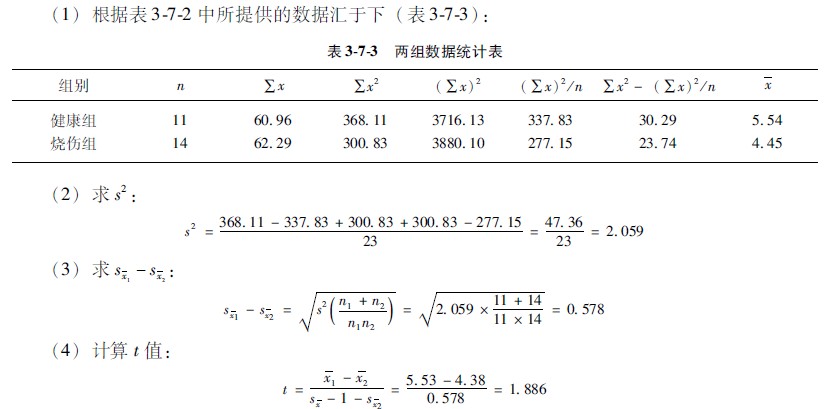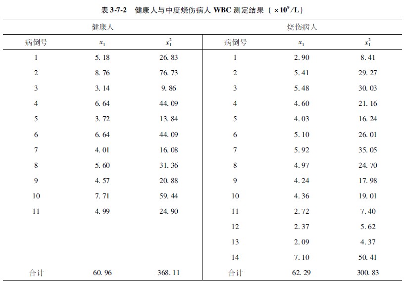 示例375某醫(yī)生研究中度燒傷病人和健康人的白細(xì)胞計數(shù),資料于下(表372)。問他們之間有無統(tǒng)計學(xué)差異?