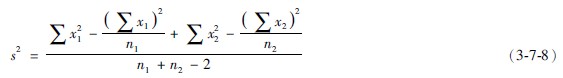 式中的n1和n2代表組1和組2的個樣本例數(shù),s2是合并標(biāo)準(zhǔn)差的平方。為了計算方便,先以公式求出合并標(biāo)準(zhǔn)差的平方(s2):