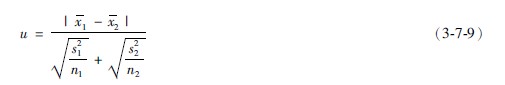 當(dāng)兩個樣本數(shù)量較大時(即兩組樣本皆大于50),不必查t值表,可采用μ檢驗方法。其公式為:
