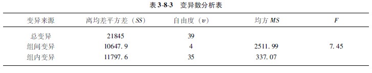 組間和組內(nèi)離均差平方和除以相應(yīng)的自由度,即得“組間均方”和“組內(nèi)均方”。以組內(nèi)均方除組間均方所得之商即為F值。方差分析模式于下(表382):