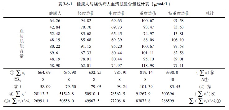示例381健康人與輕度、中度、重度、特重度燒傷病人的血清肌酸(Cre)含量記錄于表381中,問燒傷病人各期間的血清肌酸平均含量與健康人有無顯著差異?