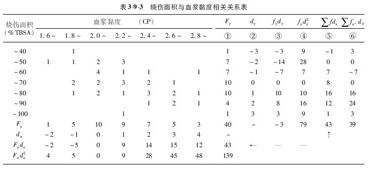(1)作相關(guān)計(jì)算表(表393):先將資料按燒傷面積(豎行)和血漿黏度(橫行)填入表中,再將豎行與橫行相交的病例數(shù)(頻數(shù))填入相應(yīng)之交叉處。如“~40%”TBSA組段血漿黏度在“16~”段處有1例,即在此處填1,余仿此。