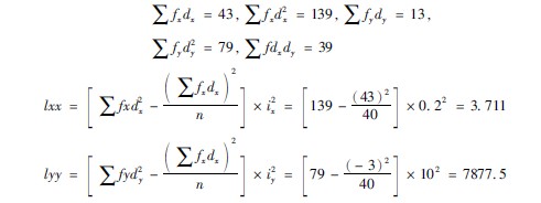 (2)參照平均數(shù)值及標(biāo)準(zhǔn)差的簡捷法,分別求出x及y的dx簡化值(dx、dy)、∑fxdx、∑fydy、 ∑fxd2x及fyd2y,填入表的響應(yīng)位置(注:∑fx=∑fy,本例均為40)。