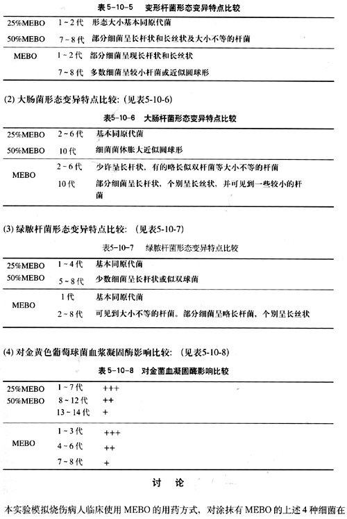 37℃,20~22h培養(yǎng)后進(jìn)行觀察比較。實(shí)驗(yàn)結(jié)果表明MEBO對上述4種細(xì)菌在導(dǎo)致形態(tài)變異,使綠膿桿菌色素消失,和使金黃色葡萄球菌血漿凝固酶產(chǎn)生能力減弱等方面都比25%MEBO和50%MEBO的作用顯著,而且出現(xiàn)早,形態(tài)變異的特點(diǎn)也有差異。實(shí)驗(yàn)結(jié)果與以前報道的不同濃度的MEBO的抗菌作用是一致的。MEBO的藥效是與MEBT配合時產(chǎn)生的。