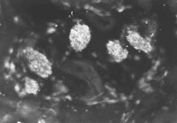 用特異的小鼠抗人角蛋白19型的單克隆抗體(McAb)對正常和燒傷皮膚免疫細胞化學(xué)觀察結(jié)果表明,兩例正常皮膚表皮再生干細胞數(shù)量較少,可見少量顯示熒光的表皮細胞再生干細胞(圖5-4-1),即角蛋白19型陽性細胞。燒傷后24h,熒光顯微鏡下,顯示熒光的表皮再生干細胞數(shù)量中等程度(圖5-4-2),燒傷后4天,在汗腺、毛細血管和毛囊周圍可見開始增多的潛在表皮干細胞(圖5-4-3)。