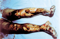 入院后立即用MEBO外涂保護創(chuàng)面,并行耕耘減張?zhí)幚?。傷?8h部分創(chuàng)面開始液化,傷后4天創(chuàng)面壞死組織已全部開始液化(圖5-3-3)。每3~4h清除創(chuàng)面液化物一次并外涂MEBO。