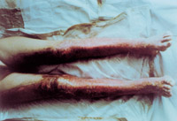 創(chuàng)面愈合后下肢功能鍛煉,創(chuàng)面繼續(xù)外用MEBO作潤膚油使用。傷后45天痊愈出院。