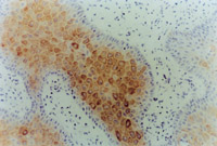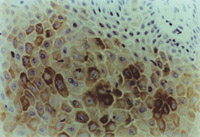 5-3-9 MEBT/MEBO治療30天,細胞角質(zhì)素AE3呈陽性。(說明患者燒傷創(chuàng)面是自我再生修復) HE×20