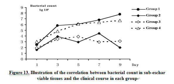 Six animals in each group were killed under aseptic manipulation at the 1st, 3rd, 5th, 7th, 9th days after treatment. A sample of heart blood was collected and cultured and a specimen of wound skin tissue was taken by sterile scalpel, as deep as the muscular fascia [12] and then cut into two parts. One part was used for bacterial count in sub-eschar viable tissue. The other was fixed in formalin for pathological examination. Sections were observed under a light microscope and the extent of bacterial invasion was classified according to three grades: “0” referring to absence of bacterium; “I” to invasion of bacteria to necrotic tissues; and “II” to invasion of bacteria to viable tissues.