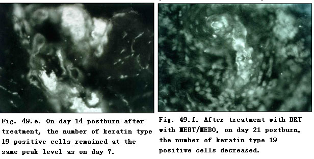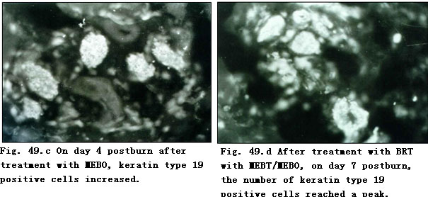 Immunocytochemical examinations were made on normal skin and burns wounds tissue sections treated with specific mouse anti-human keratin type 19 monoclonal antibody. The results revealed that in the normal control of both cases, there were few positive numbers of epidermal stem cells with keratin type 19 (Fig. 49. a). Wound tissue at 24 h postburn showed a moderate amount of positive epidermal regenerative stem cells (Fig. 49. b) and on day 4 postburn, the number of positive epidermal stem cells around the sweat gland, capillaries and hair follicles increased (Fig. 49. c). On days 7 (Fig. 49. d) and 14 (Fig. 49. e), epidermal stem cells containing human keratin type 19 continually increased and exceeded the level attained at day 4 postburn, before gradually reaching a peak level. Prior to days 21 (Fig. 49. f) and 28 (Fig. 49. g) postburn, the number of positive regenerative stem cells decreased to a certain level as the burns wounds progressed to healing. The observation showed that, after treatment with BRT with MEBT/MEBO, the proliferation status of the potential regenerative stem cell of the burns patients changed at a regular rate. We propose that regenerative stem cells may be the source of epidermal regenerative stem cells. The glowing fluorescent cells found observed under the microscope represented the potential regenerative stem cells in the wound tissues of deep second- and superficial third-degree burns. After treatment with MEBO, these stem cells may aid the deep partial thickness burns wounds to heal without scar formation and aid the superficial full-thickness burns wound to regenerate skin while healing spontaneously.