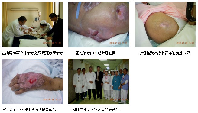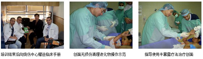 6、2010年1月27日上午10時(shí),陳教授一行應(yīng)邀到了沙特阿拉伯首都Riyadh市,下了飛機(jī)便直奔Riyadh市最大的私營(yíng)醫(yī)院------Riyadh Care Hospital(800病床),與外科主任Dr. Mohammad Khaled Yonssef 和科室醫(yī)師進(jìn)行了學(xué)術(shù)交流,然后應(yīng)邀到病房會(huì)診指導(dǎo)一例30%TBSA深I(lǐng)I度燒傷患者的治療,全程示范和指導(dǎo)創(chuàng)面的換藥,收到了很好的培訓(xùn)效果,為以后再生醫(yī)療技術(shù)在該院的進(jìn)一步推廣奠定了基礎(chǔ)。