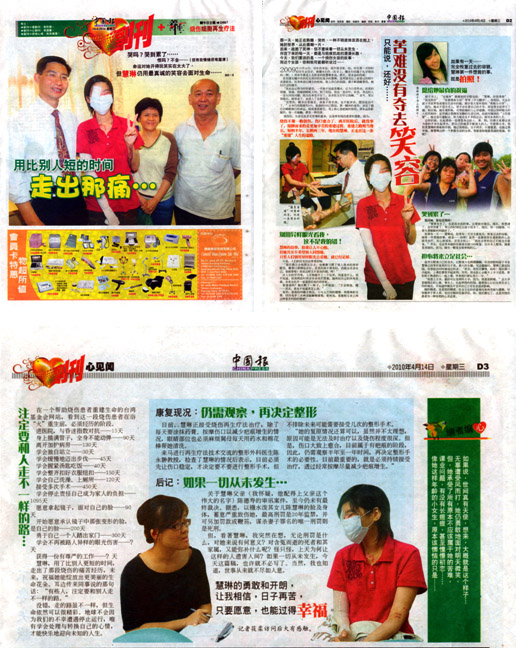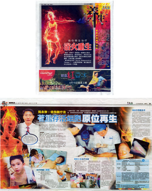 馬來西亞中國報于2010-4-14日用了5版的篇幅對燒傷再生療法進行了報道,據(jù)中國報的反饋,很多民眾和組織電話詢問有關(guān)再生醫(yī)學(xué)的治療方法的問題,引起了一定的學(xué)術(shù)和社會效應(yīng)。