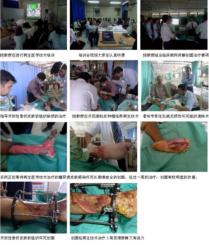 6、2010年4月23日,吉隆坡中央醫(yī)院(馬來西亞最大醫(yī)院,2500病床和吉隆坡大學(xué)醫(yī)院的燒傷再生醫(yī)學(xué)技術(shù)培訓(xùn)和學(xué)術(shù)交流會在吉隆坡中央醫(yī)院燒傷整形科教研室舉行。培訓(xùn)會由吉隆坡中央醫(yī)院燒傷整形科主任Dr. Normala教授主持,來自這兩家主要醫(yī)院的燒傷、整形和創(chuàng)傷專業(yè)的20余名專家參加了培訓(xùn)會,陳教授應(yīng)邀向參會的主要專家演講了燒傷再生醫(yī)學(xué)與療法的皮膚再生機(jī)理、臨床技術(shù)規(guī)范和該技術(shù)在其它多學(xué)科的應(yīng)用,引起了大家極大的興趣和學(xué)習(xí)熱情,為下階段燒傷再生醫(yī)學(xué)技術(shù)進(jìn)入這兩家馬來西亞最大、最主要的醫(yī)院,做好了充分的準(zhǔn)備。