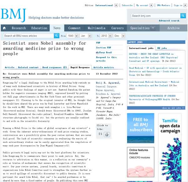 對于像徐榮祥這樣的科學家來說,公眾抗議和法律訴訟可能不是發(fā)表觀點、尋求正義的最好平臺。但是,這種求助于法律仲裁的手段卻反映了我們作為那些確??茖W成就獲得應有認可的各機構(gòu)的委托方在發(fā)揮作用時是存有問題的。我們的同行審查系統(tǒng)、雜志董事會、科學委員會以及像諾貝爾委員會這樣的組織都需要進一步加強體制以避免科學領(lǐng)域內(nèi)的紛爭流溢到社會公共領(lǐng)域;特別是對諾貝爾獎這樣的獎項而言,這樣的獎項不能授予給已去世的人、也不能被超過一定數(shù)量的人所共享。英國醫(yī)學雜志(BMJ)能發(fā)布這一訴訟消息就已然說明科學雜志也應履行起“看門人”的職責而不只是承擔“啦啦隊長”的責任。