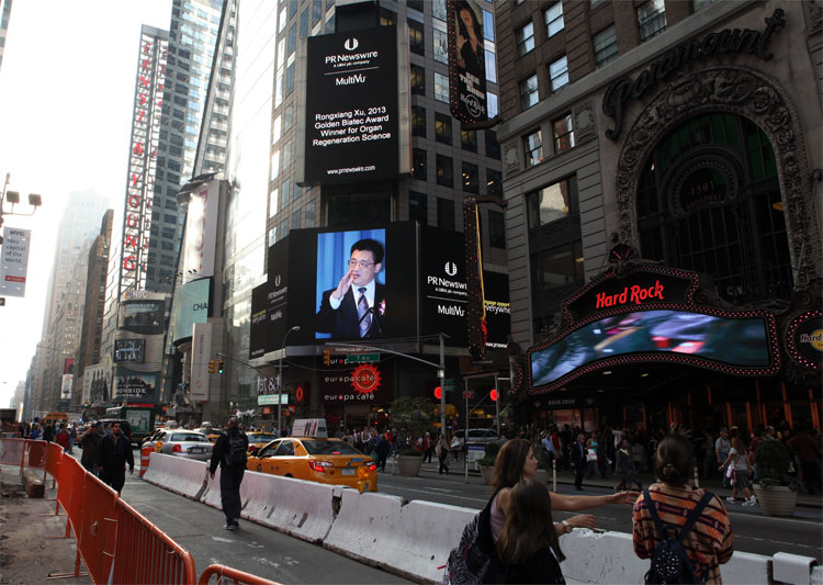 昨天,路透社在第一時間報道了徐榮祥博士獲得2013年GOLDEN BIATEC 國際獎的新聞,同時在紐約時代廣場大屏幕,刊出了徐榮祥博士的巨幅照,這是路透社第五次在紐約時代廣場大屏幕刊登徐榮祥博士的巨幅照片。表明了路透社對器官再生科學(xué)極大的關(guān)注。也表明了世界已經(jīng)進(jìn)入“器官再生科學(xué)”的新時代。器官再生科學(xué)時代的到來,結(jié)束了上百年的生命科學(xué)的設(shè)計(jì)想象研究階段,人類生命科學(xué)由虛擬的研究進(jìn)入到人體應(yīng)用研究階段。