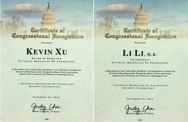 美國(guó)國(guó)會(huì)議員及洛杉磯教委委員對(duì)徐榮祥基金會(huì)的成立表示祝賀,并頒發(fā)證書(shū)。國(guó)會(huì)議員趙美心表示,目前美國(guó)正面臨醫(yī)生資源短缺、政府在醫(yī)學(xué)領(lǐng)域投資縮減的局面,并且在某些新技術(shù)與發(fā)明上已經(jīng)滯后,而在基金會(huì)贊助下成立的研究中心將有利于扭轉(zhuǎn)這一局面,在損傷器官領(lǐng)域作出突破性貢獻(xiàn)。趙美心認(rèn)為,徐榮祥基金會(huì)的成立不僅僅是為了向徐大夫致敬,更代表著一個(gè)可以令人類世世代代更健康的契機(jī)。