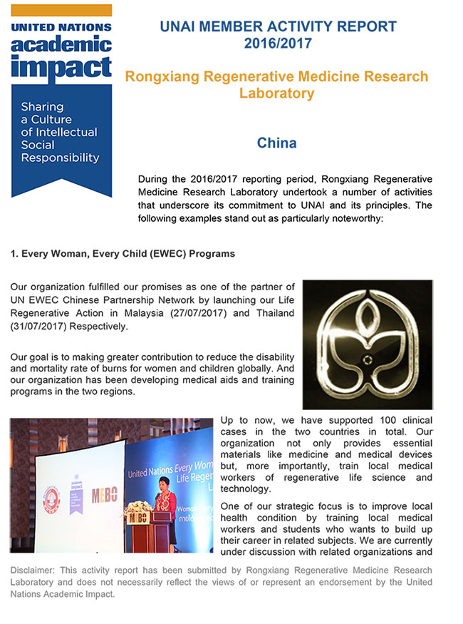 日前,“聯(lián)合國學術影響”組織特別公布其成員北京榮祥再生醫(yī)學研究所2016-2017年度承諾報告,特別展示了其發(fā)起的聯(lián)合國“每個婦女 每個兒童”中國合作伙伴網(wǎng)絡承諾,分別在馬來西亞(2017年7月27號)和泰國(2017年7月31號)開展的“生命再生行動”外,還對以燒傷濕潤暴露療法為核心進行的一帶一路倡議——“全球再生醫(yī)療技術研習班”進展也作為年度重要貢獻項目進行了特別公布。