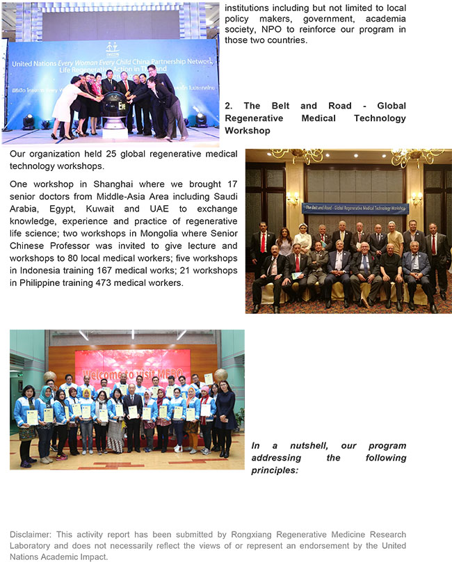 自2016年7月,北京榮祥再生醫(yī)學研究所成為“聯(lián)合國學術影響“成員來,致力于遵循聯(lián)合國學術影響“消除貧困、可持續(xù)發(fā)展、全民教育“等原則:對沙特、埃及、科威特、菲律賓、阿聯(lián)酋、印尼等醫(yī)務工作者進行培訓,2017年,共舉辦了25個“全球再生技術研習班”,總計約千名一帶一路沿線國家醫(yī)務工作者接受了培訓。