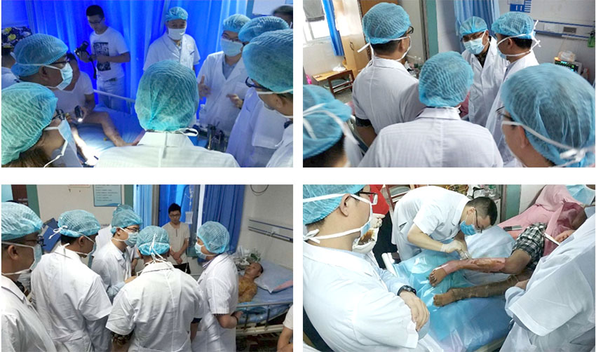 9月4日,印尼來訪專家一行準(zhǔn)時(shí)來到郫都區(qū)人民醫(yī)院燒傷創(chuàng)瘍科參觀交流,付子俊教授及王鄉(xiāng)寧主任帶領(lǐng)科內(nèi)醫(yī)生歡迎了來訪的各位專家,并介紹了醫(yī)院及科室的發(fā)展情況。隨后來訪專家們依次觀摩學(xué)習(xí)了了大面積燒傷(其中包括煤氣燒傷、熱油燒傷等病例)、斷指、糖尿病足潰瘍等20余病患的治療過程,并就系統(tǒng)治療、初期創(chuàng)面處理、抗感染方案等臨床操作問題進(jìn)行了現(xiàn)場(chǎng)交流。