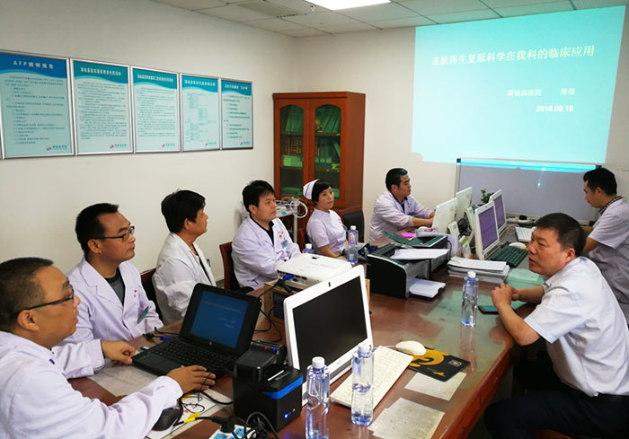 隨后,楊智斌總裁與陜西美寶相關(guān)負責(zé)人一行,來到陜西地區(qū)最早引進再生醫(yī)療技術(shù)的單位之一陜西省人民醫(yī)院,與燒傷科孫要文主任進行了會談。孫主任表示,希望雙方能夠在臨床研究和學(xué)術(shù)交流中加強合作,進一步推進再生醫(yī)療技術(shù)的深入發(fā)展。