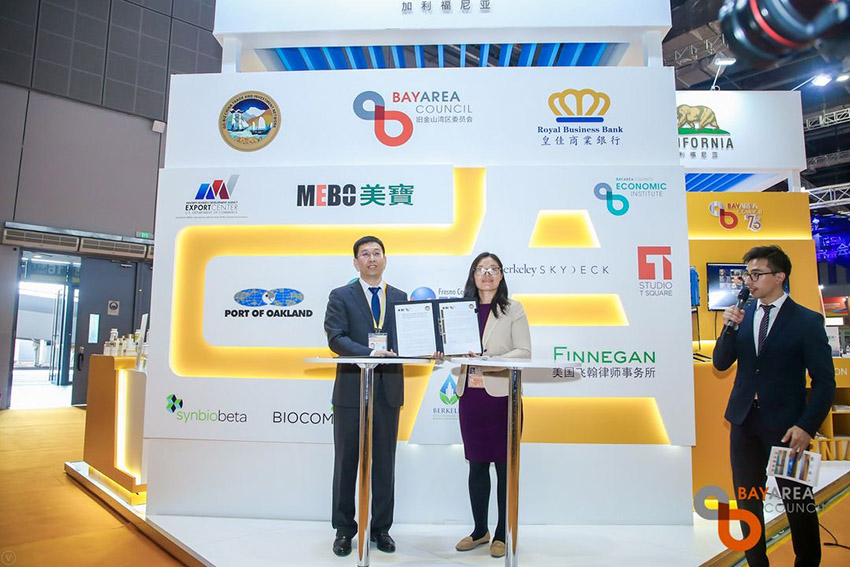 美寶集團總裁楊智斌,副總裁劉鋼、商慶新,灣區(qū)委員會全球倡議副主席兼中國業(yè)務(wù)總監(jiān)鄒艷玲(Jennifer Zou)在加州館進博會現(xiàn)場參加了此次儀式。