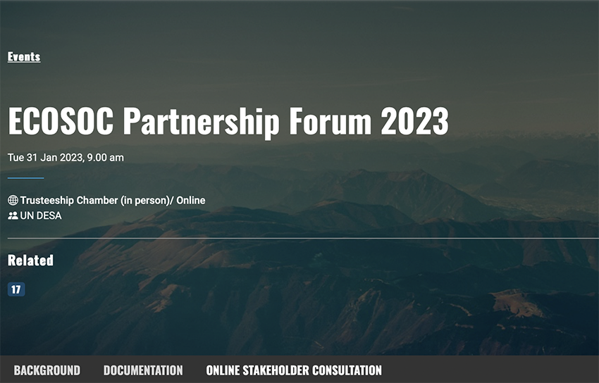 聯(lián)合國經(jīng)濟及社會理事會(ECOSOC)2023年伙伴關(guān)系論壇將于美東時間2023年1月在紐約聯(lián)合國總部舉行,而基于 “加快新冠疫情(COVID-19)后修復,全面落實2030年可持續(xù)發(fā)展議程”的目標,聯(lián)合國經(jīng)濟及社會理事會旨在通過匯集聯(lián)合國各成員國和利益攸關(guān)方——包括國際組織、地方政府、非政府組織、私營部門、民間社團以及科學家、學術(shù)界、婦女、青年等——以創(chuàng)新方式,推動聯(lián)合國可持續(xù)發(fā)展目標(SDGs)的實現(xiàn),并特別強調(diào)伙伴關(guān)系在這方面可發(fā)揮的重要作用。