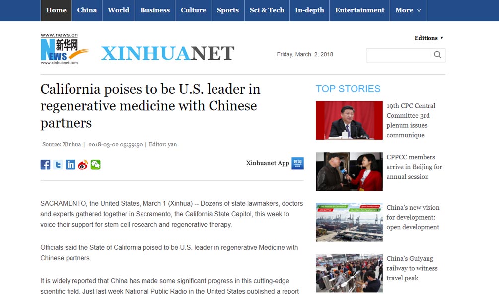 新華網(wǎng):加州與中國伙伴合作有意成為美國再生醫(yī)學(xué)領(lǐng)路人