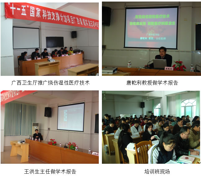 為在廣西壯族自治區(qū)構(gòu)建省、市、縣三級(jí)燒傷皮膚原位再生復(fù)原技術(shù)醫(yī)療救治網(wǎng)絡(luò),達(dá)到盡快在廣西全區(qū)普及并規(guī)范燒傷皮膚原位再生復(fù)原醫(yī)療技術(shù)之目的,受廣西中醫(yī)藥管理局委托,根據(jù)廣西自治區(qū)衛(wèi)生廳2009年2月25日下發(fā)的“關(guān)于協(xié)助開展農(nóng)村醫(yī)療衛(wèi)生適宜技術(shù)培訓(xùn)班”的函(桂衛(wèi)函〔2009〕號(hào))中關(guān)于“為開展好我區(qū)農(nóng)村醫(yī)療衛(wèi)生適宜技術(shù),由廣西中醫(yī)藥管理局呂琳副局長(zhǎng)和廣西中醫(yī)學(xué)院科技處處長(zhǎng)唐乾利教授帶領(lǐng)的廣西中醫(yī)藥適宜技術(shù)推廣培訓(xùn)班專家組及工作人員一行20人等,由南寧前往金秀分批對(duì)該縣縣、鄉(xiāng)(鎮(zhèn))、村各級(jí)醫(yī)藥技術(shù)人員開展燒傷濕性醫(yī)療技術(shù)臨床規(guī)范化應(yīng)用等5項(xiàng)適宜技術(shù)的免費(fèi)推廣培訓(xùn)。第一期培訓(xùn)班于2009年3月7~9日在位于廣西金秀縣桐木鎮(zhèn)的金秀縣人民醫(yī)院桐木分院六樓會(huì)議室舉行。