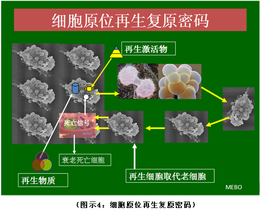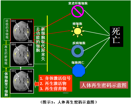 首先復(fù)習(xí)一下第一個生命之謎(詳見圖示3)?!捌平馊梭w生命延續(xù)之謎”我們在2002年就已經(jīng)公布了,秘密在于當(dāng)人體細(xì)胞在開始走向衰老、癌變、疾病、凋亡這四個路線的時候,其臨近的再生潛能細(xì)胞可以在再生物質(zhì)的作用下被激活并發(fā)揮其細(xì)胞自身的再生潛能,從而再生出新的細(xì)胞取代原來失去功能的細(xì)胞,這是人體再生復(fù)原的密碼和機(jī)理,它早已在斷指、燒傷、創(chuàng)傷、胃腸粘膜損傷等多個領(lǐng)域得以應(yīng)用并獲得成功。在人體再生復(fù)原程序公布以后,世界生命科學(xué)的研究方向都開始逐步調(diào)整到這個方向上來,而我們則已經(jīng)開始人體應(yīng)用了,并且根據(jù)實(shí)現(xiàn)的結(jié)果、總結(jié)的規(guī)律證明了再生科學(xué)的真實(shí)性,就跟破案一樣,根據(jù)結(jié)果逐步推理得出事實(shí),而很多生命科學(xué)的研究者還處于探究之路上,所以說我們是完成者的秘密,他們是探索者的小結(jié)。