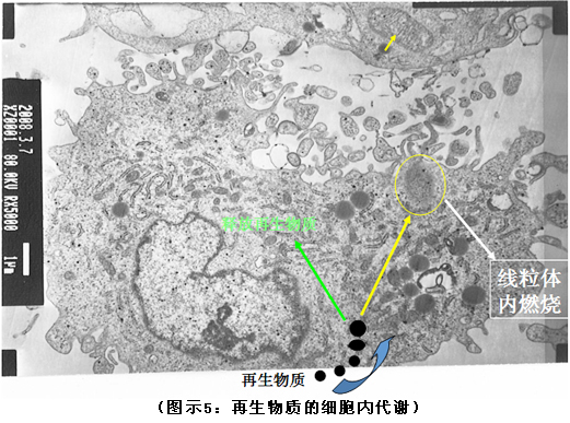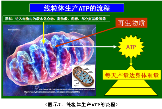 線粒體的膜有很多功能,會產(chǎn)生各種酶,酶可以把大自然的能量變成身體的能量,大自然的物質(zhì)變成身體的物質(zhì),我們的再生物質(zhì)進(jìn)入人體大部分成分就變成ATP了(部分物質(zhì)分離出來,以后會講到),人體會發(fā)熱但是不會長胖,都變成能量釋放出來了(詳見圖示7)。比如四川地震時有的被埋幾天的老年人身體極度虛弱,服用再生物質(zhì)后則能很快下床活動了等等。