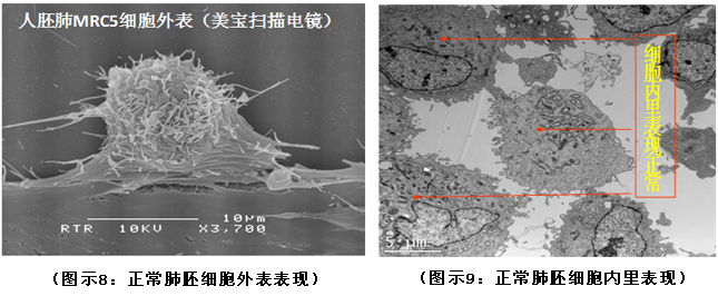 常規(guī)進(jìn)行細(xì)胞培養(yǎng)實(shí)驗(yàn)推動細(xì)胞成活,正常的人肺胚細(xì)胞加入再生營養(yǎng)物質(zhì)后(詳見圖示8、9),觀察其動態(tài)。細(xì)胞內(nèi)線粒體呈圓形或扁豆型等,形態(tài)不一,