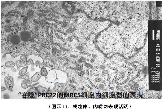 肝臟內(nèi)的線粒體最多,因其合成蛋白質(zhì)多,需要能量多?;氐轿覀兊脑囼?yàn),再生物質(zhì)顆粒進(jìn)入肺胚細(xì)胞后(詳見圖示10),線粒體活躍,細(xì)胞即開始分裂啟動,細(xì)胞核染色體出現(xiàn)變化,開始進(jìn)行分裂。
