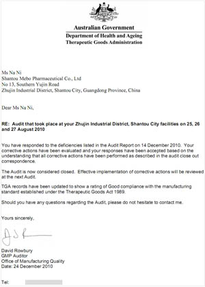 2010年12月24日,在圣誕平安夜來臨前,集團(tuán)總部收到最好的圣誕禮物——下屬汕頭市美寶制藥有限公司通過澳大利亞TGA(Therapeutic Goods Administration)的全部審核,結(jié)果符合要求,將在圣誕節(jié)后發(fā)放GMP證書GMP認(rèn)證證書 (GMP Certificate of Manufacturing Facility)。