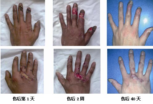 本組28例手部電擊傷創(chuàng)面全部治愈,愈合時(shí)間最短22天,最長65天,平均39天。創(chuàng)面愈合后無明顯瘢痕生長或淺表性瘢痕柔軟,無明顯關(guān)節(jié)功能障礙。(見下圖)